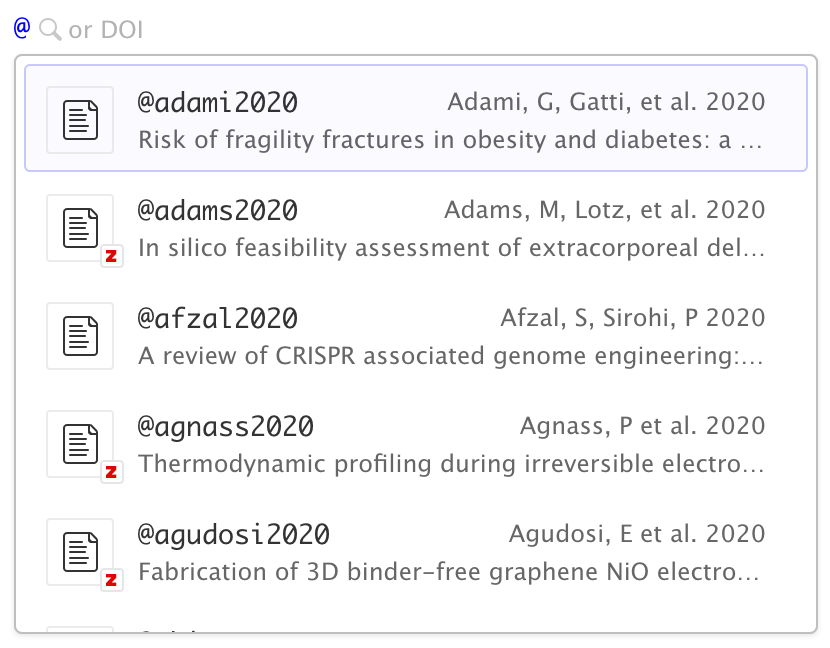 If you are using markdown syntax, you can also paste a DOI after the [@ and it will be looked up: